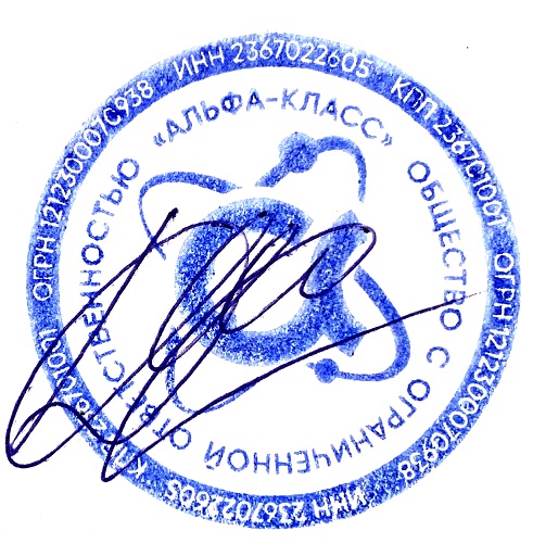 Администрация – владелец Сайтов (Общество с ограниченной ответственностью "АЛЬФА-КЛАСС", действующее на основании устава (ОГРН 1212300070938), осуществляющее управление Ресурсом и взаимодействие с Потребителем, а также совершающее иные действия, связанные с использованием Сайта.